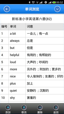 单词浏览:选择需要的课程,点击右下角的功能菜单,选择单词浏览,系统获取该课程所有单词,并以列表形式出现所有单词和词义,用户点击某个单词可自动发音,用户可在此添加,修改,或删除某个单词。