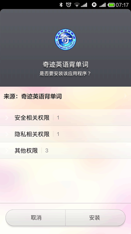 安装说明:下载到手机后,找到QjEnglish.apk文件,点击即可安装,软件需要40M左右的空间,要保证手机空间足够,安装完成后,在手机应用程序中,找到 QjEnglish 奇迹智能英语图标,点击即可打开: